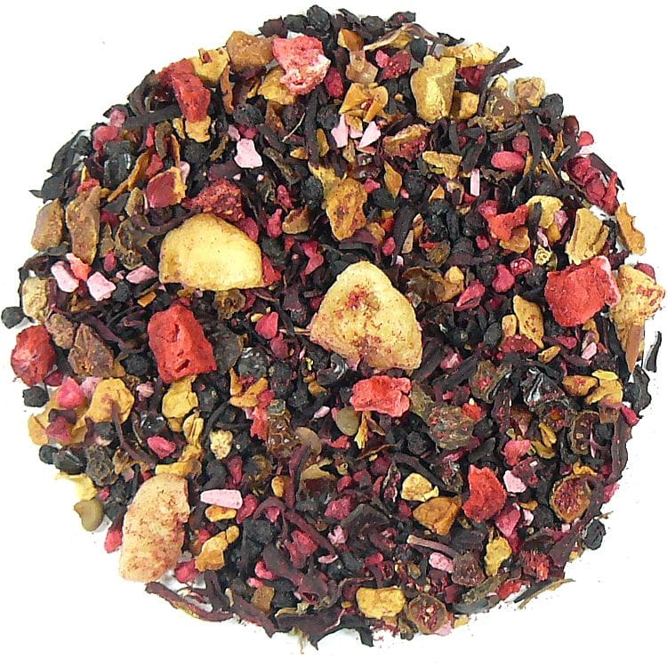 skład: hibiskus, czarny bez, jabłko, skórka róży, banan płatki, gruszka pieczona suszona, malina liofilizowana, truskawka liofilizowana.