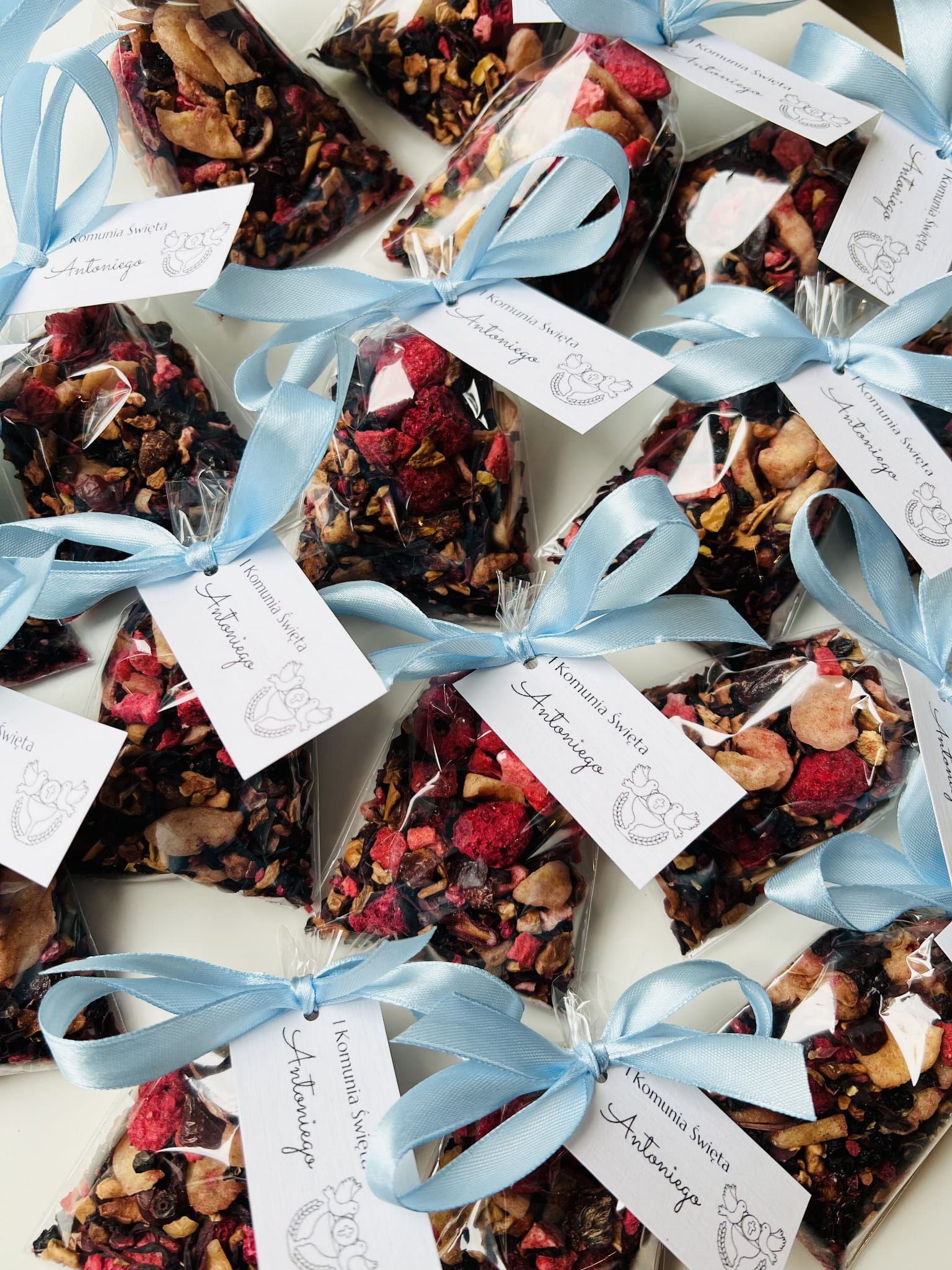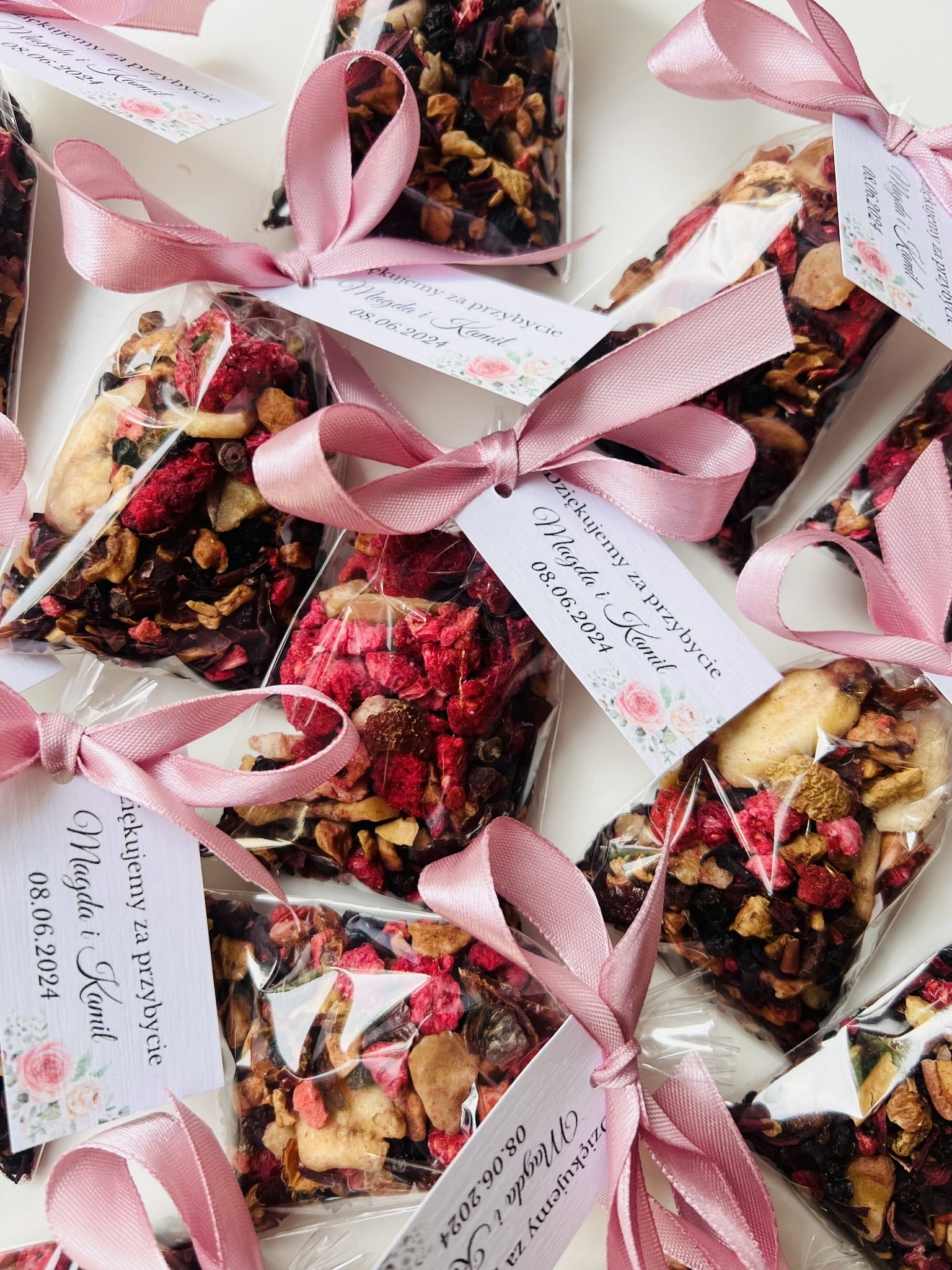Malinowe szczęście: skład hibiskus, malina, banan, gruszka, czarny bez, truskawka.