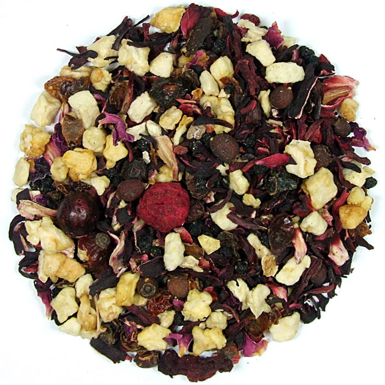 Składniki: hibiskus, jabłko, czarny bez, głóg, skórka róży i cytryny, czarna porzeczka, płatki róży, owoc maliny, aromat.
